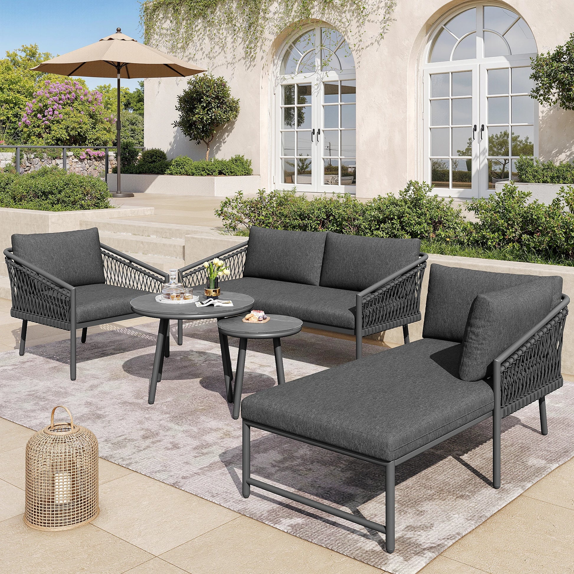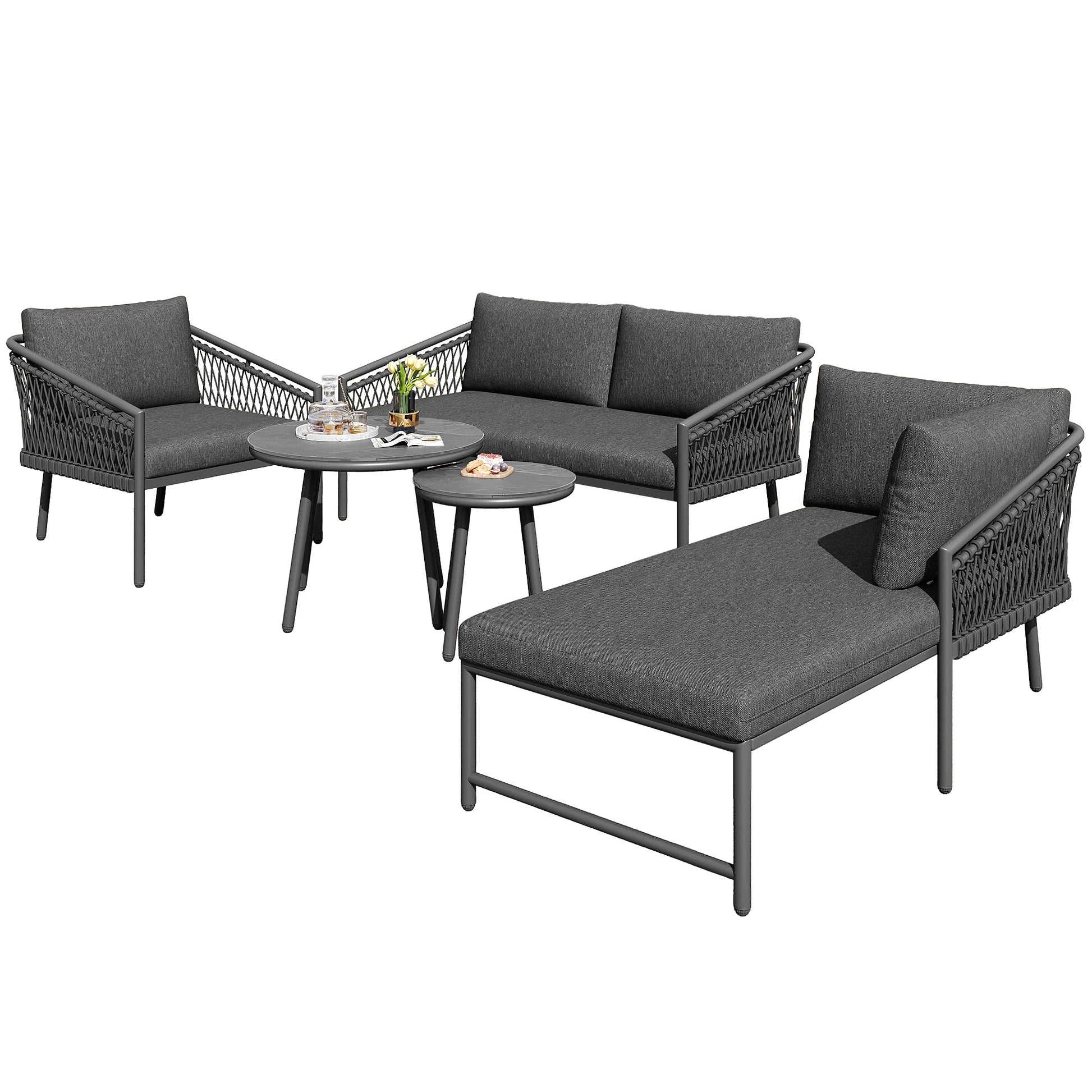 Ge din uteplats en elegant och tidlös uppgradering med detta moderna trädgårdsset i 5 delar. Setet innehåller en tvåsitssoffa, en solsäng, en fåtölj samt två runda bord med härdat glas i träimitation. Den stilrena designen kombinerar moderna linjer med vintageinspirerade detaljer, vilket gör detta set till ett iögonfallande inslag i alla utomhusmiljöer.