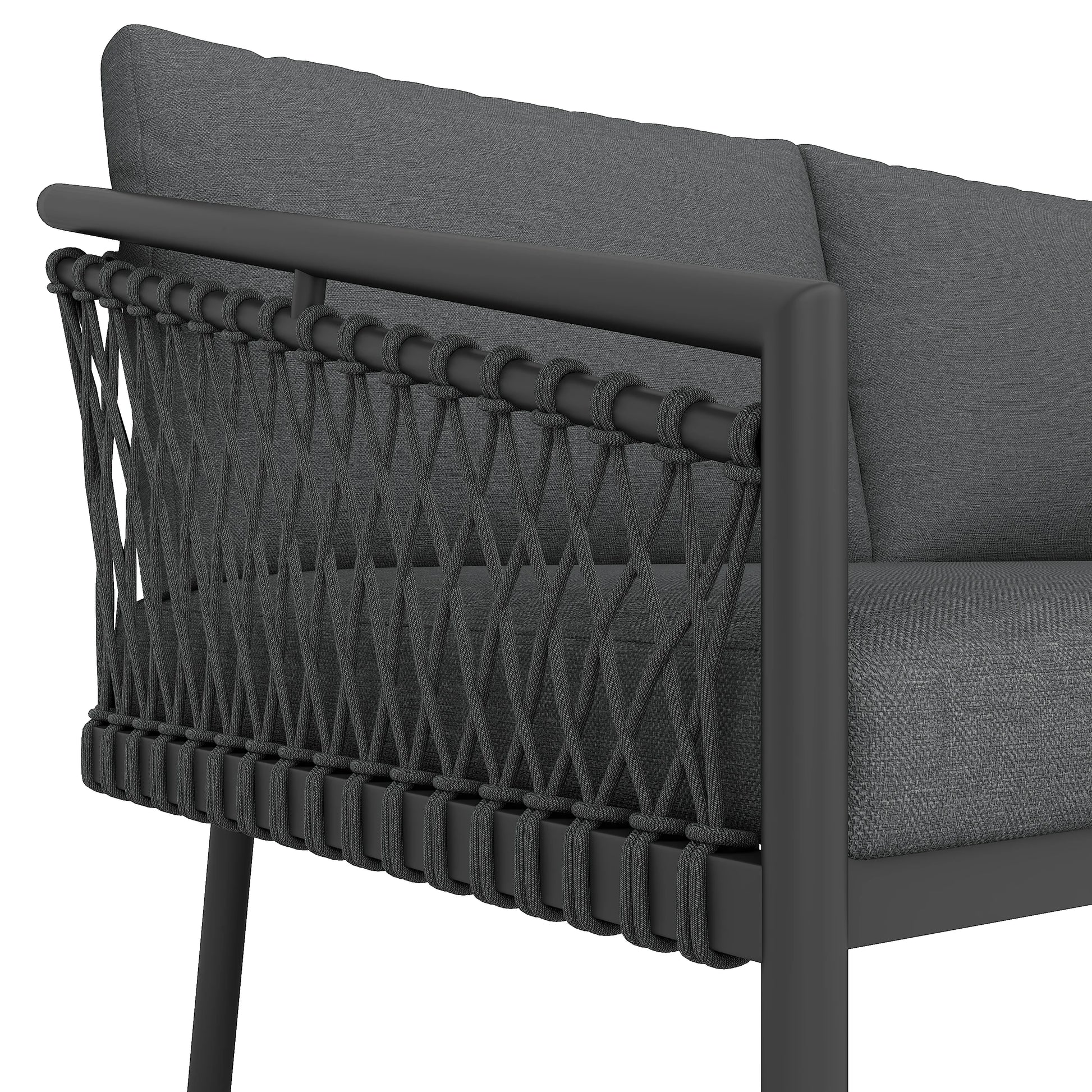 Möblerna har galvaniserade järnramar som behandlats med rostskyddande beläggning för extra hållbarhet. Ryggstöd och armstöd är klädda i flätat rep, vilket inte bara ger en estetisk touch utan även extra hållfasthet mot väder och vind. De medföljande 8 cm tjocka sitt- och ryggdynorna erbjuder hög komfort och stöd för ryggen.