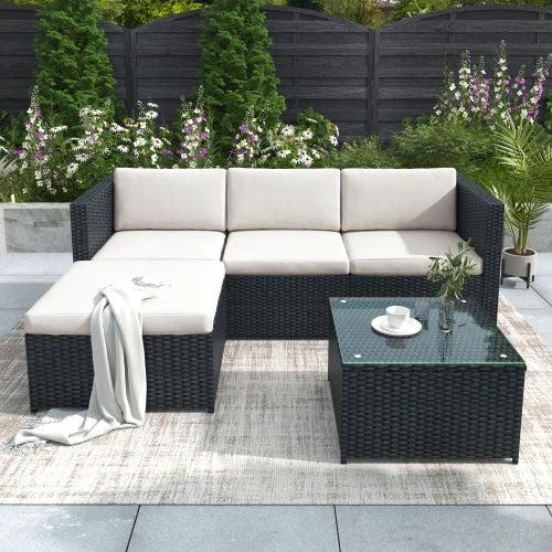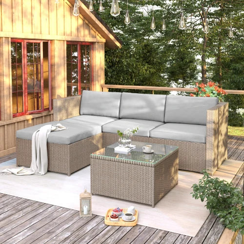 Skapa en inbjudande loungemiljö på uteplatsen med detta stilrena utemöbelset i konstrotting. Setet består av en rymlig hörnsoffa med plats för fyra personer samt ett matchande soffbord med glasskiva. Den naturligt khakifärgade rottingen kombineras med grå vattenavvisande dynor som ger både komfort och tålighet mot väderpåverkan.